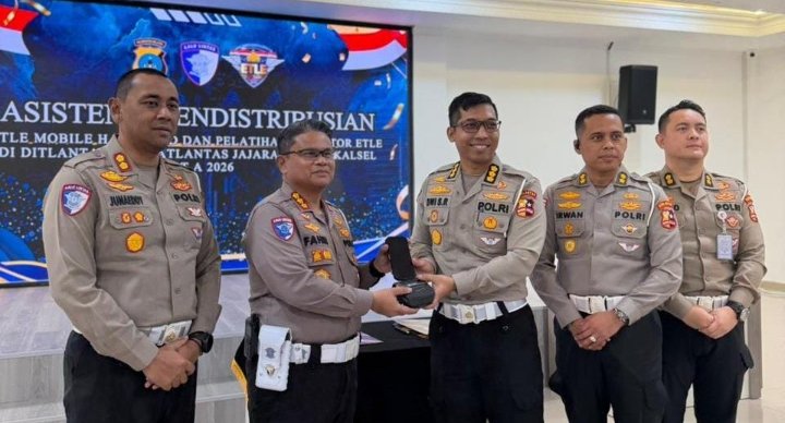 Penyerahan perangkat dilakukan oleh Kasubdit Dakgar Ditgakkum Korlantas Polri, Kombes Pol Dwi Sumrahadi Rakhmanto, kepada Direktur Lalu Lintas Polda Kalsel, Kombes Pol Dr. M. Fahri Anggia Natua Siregar, Kamis (26/2/2026).