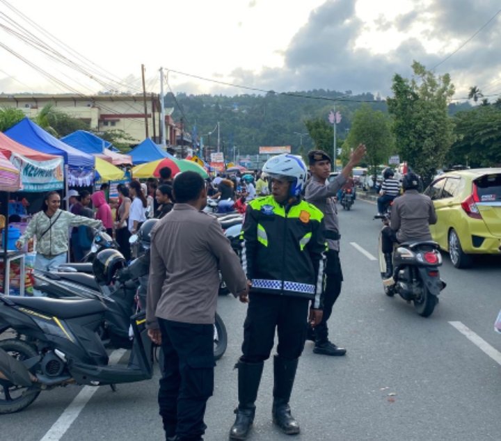 Keterangan foto Personel Polresta Manokwari mengatur arus lalu lintas saat warga berburu takjil.